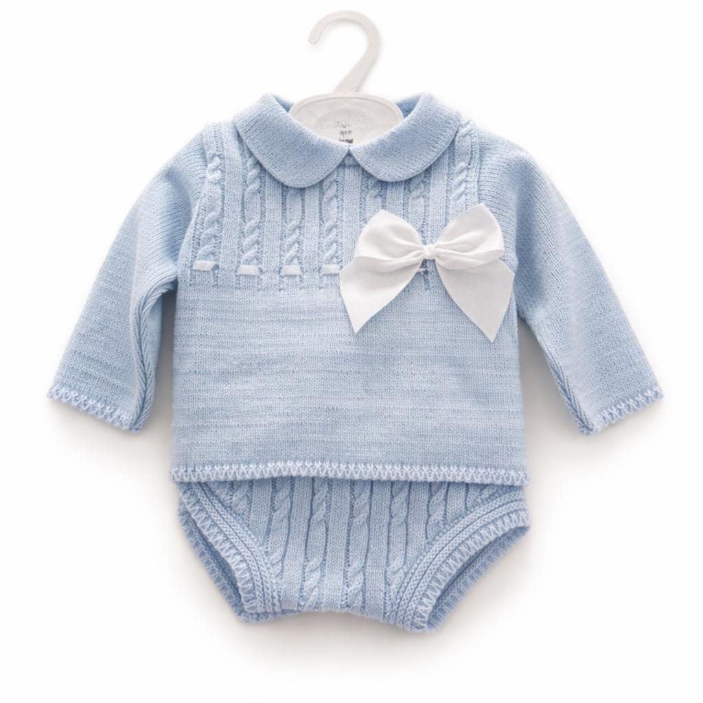 featuring a soft baby blue knit , this classic two piece includes a long sleeve top with a delicate collar and bow detail ,paired with matching knit shorts .