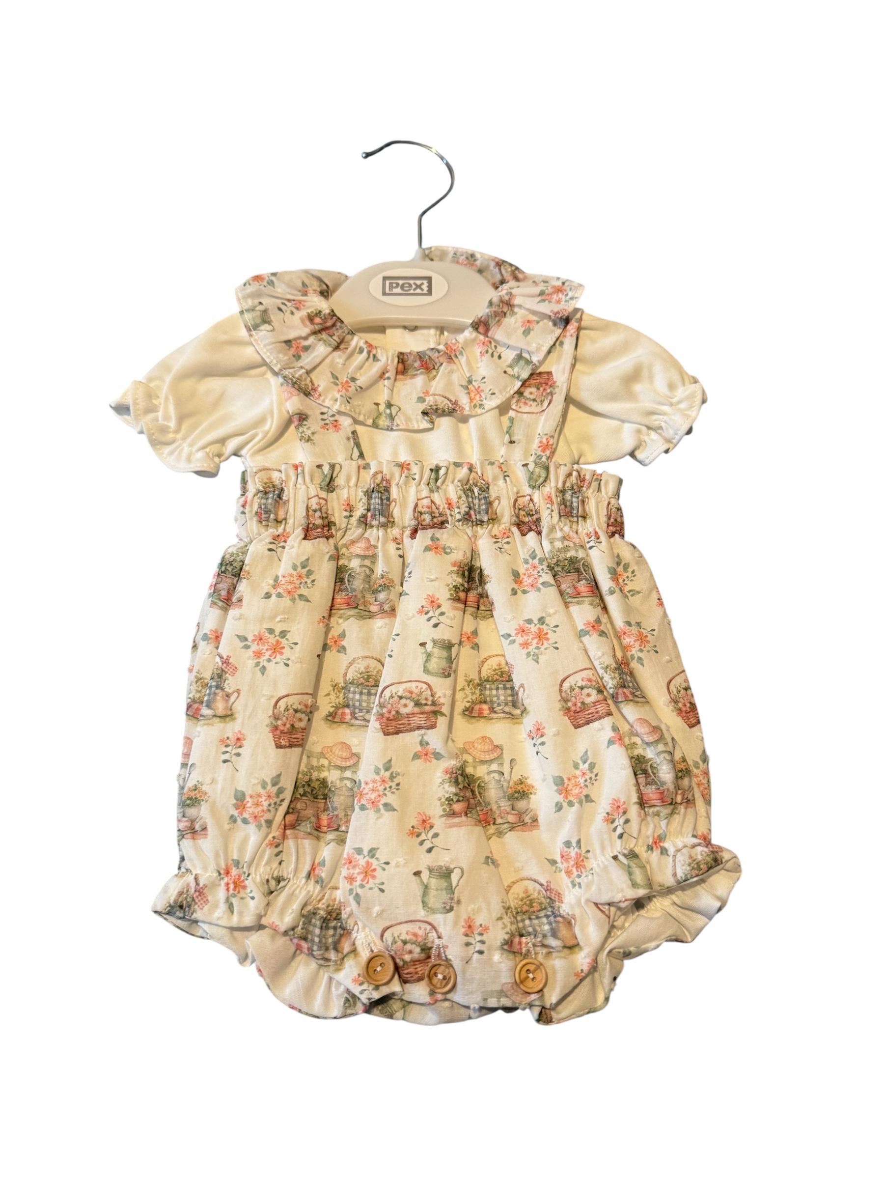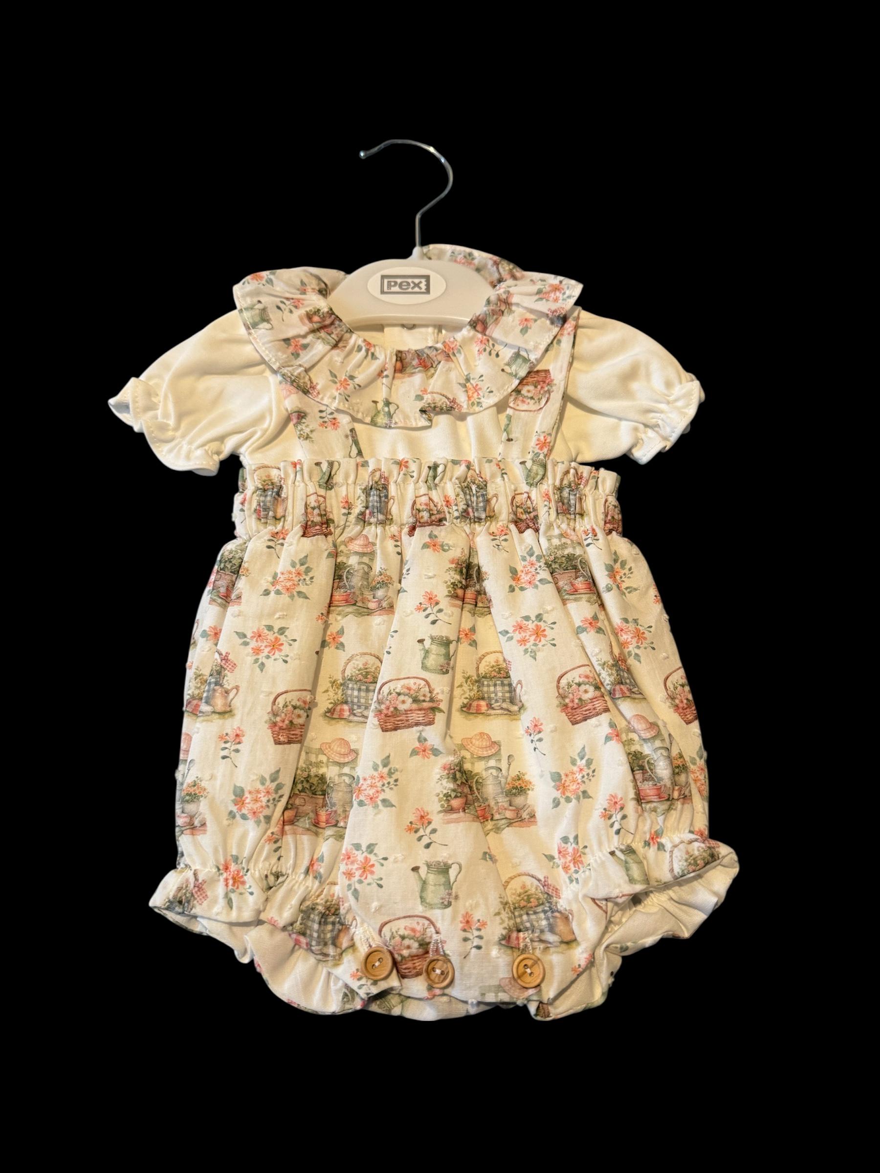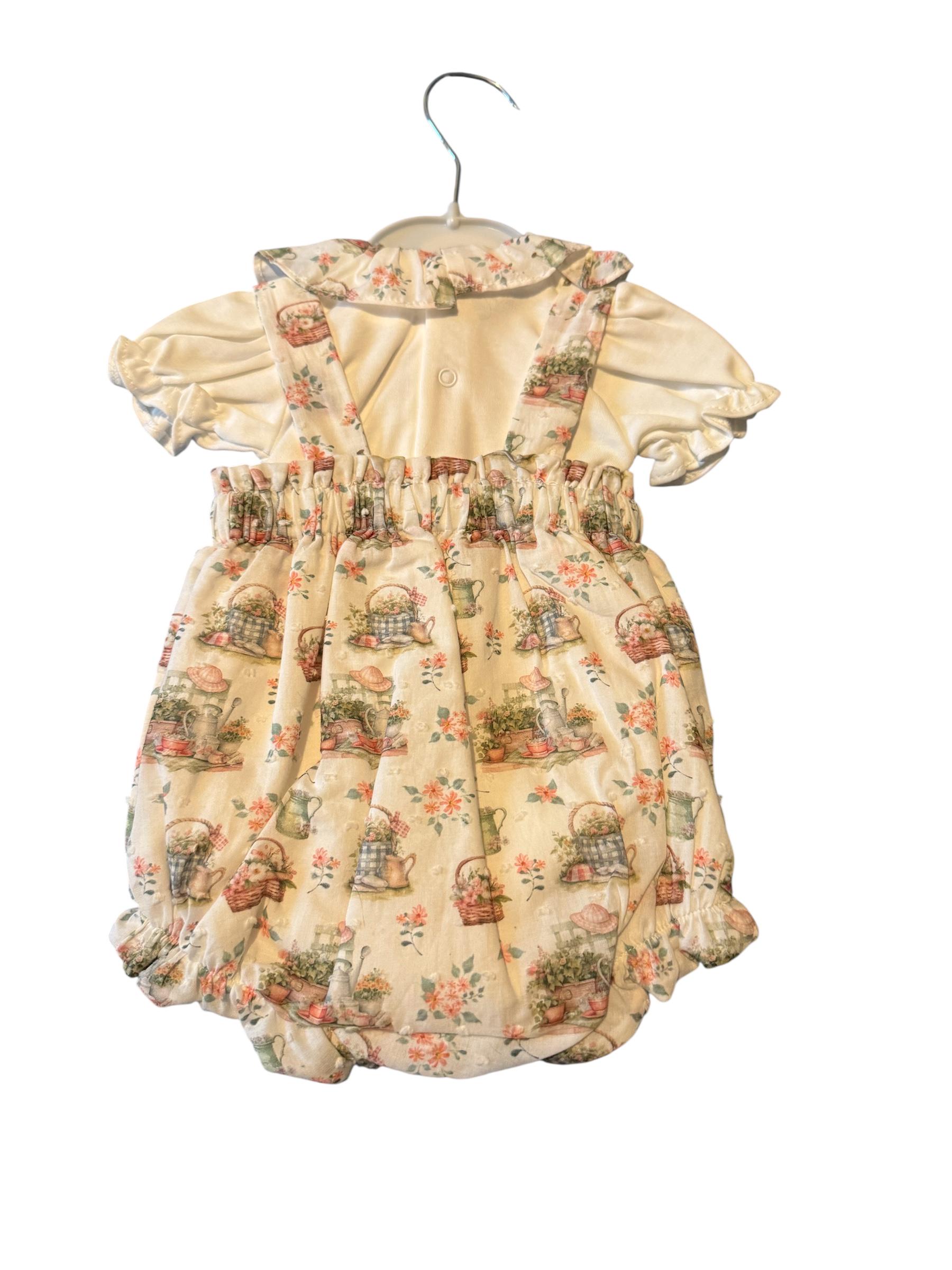 Great outfit with flower basket detail cream top with multi coloured dungarees